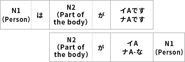 N2 が イA-い / ナA-な + N1(Person) - Used when talking about a person's appearance.