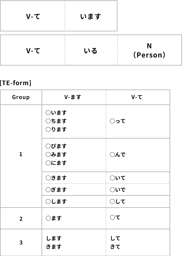 V-て いる + N(Person) - Used when describing a person by mentioning the person's actions, an object the person is wearing, etc.