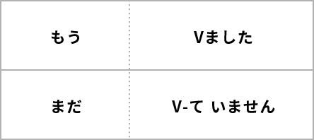 まだ V-て いません - Used when saying whether an action or event has ended.