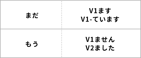 もう V1 ません/ V2 ました - Used when saying whether an action or event has not ended.